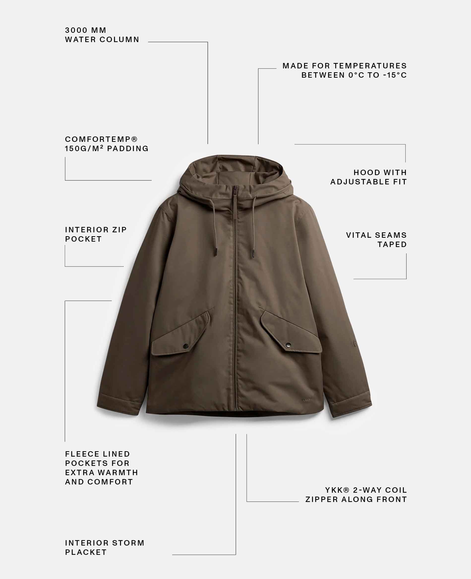 - Costuras selladas en capucha, hombros y sisas.