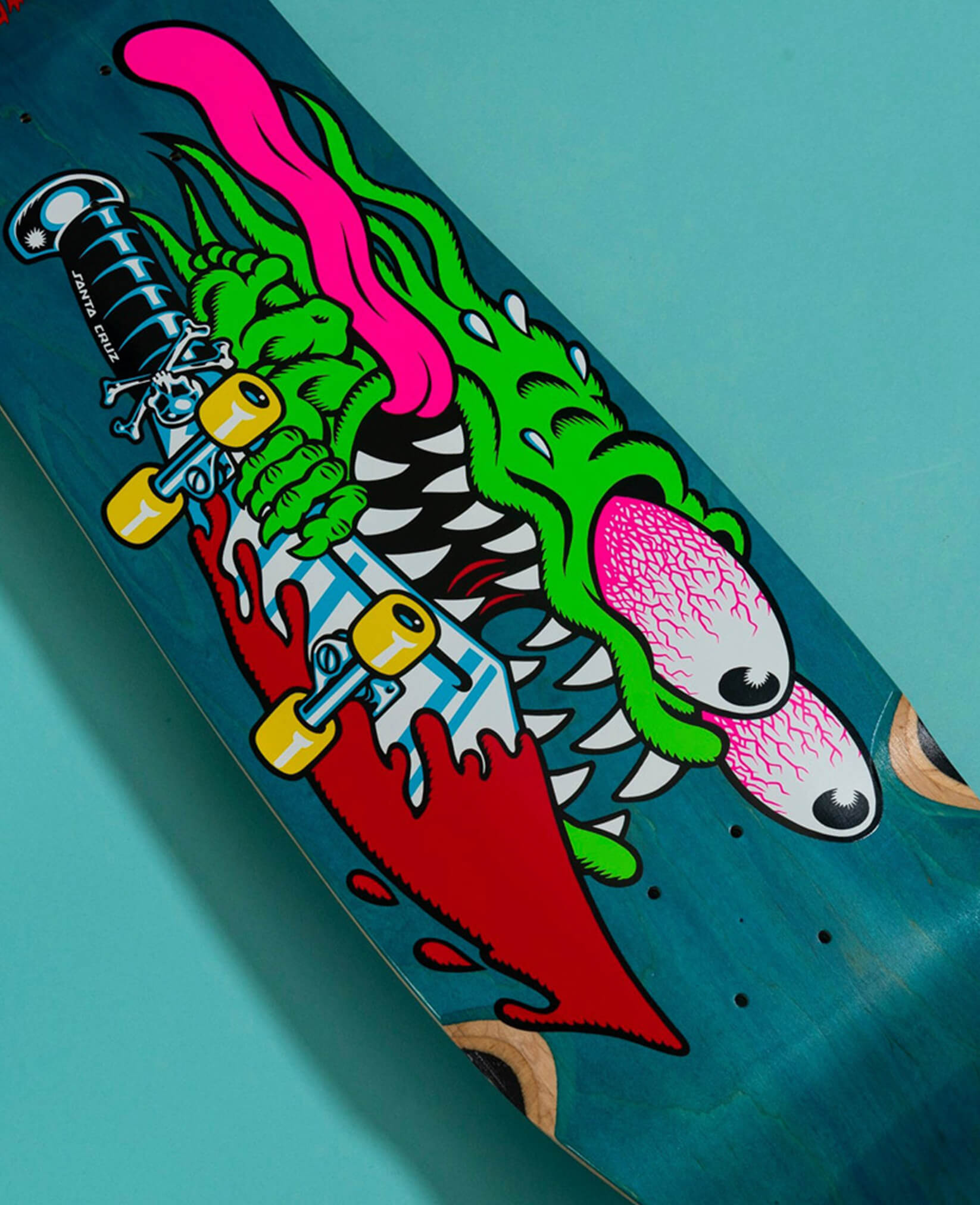 Tabla de Santa Cruz SkateboardS Keith Meek Slasher, con gráfico brillante en 7 capas de arce norteamericano prensadas individualmente con epoxi, lo que hace una tabla fuerte y receptiva con un pop duradero y un cóncavo y una patada consistentes.